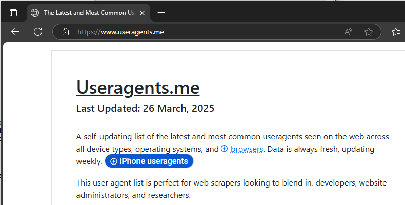 The updates of useragents.me stopped back on March 26, 2025. I think the service is no longer maintained. I will search for another service to fulfill this purpose.